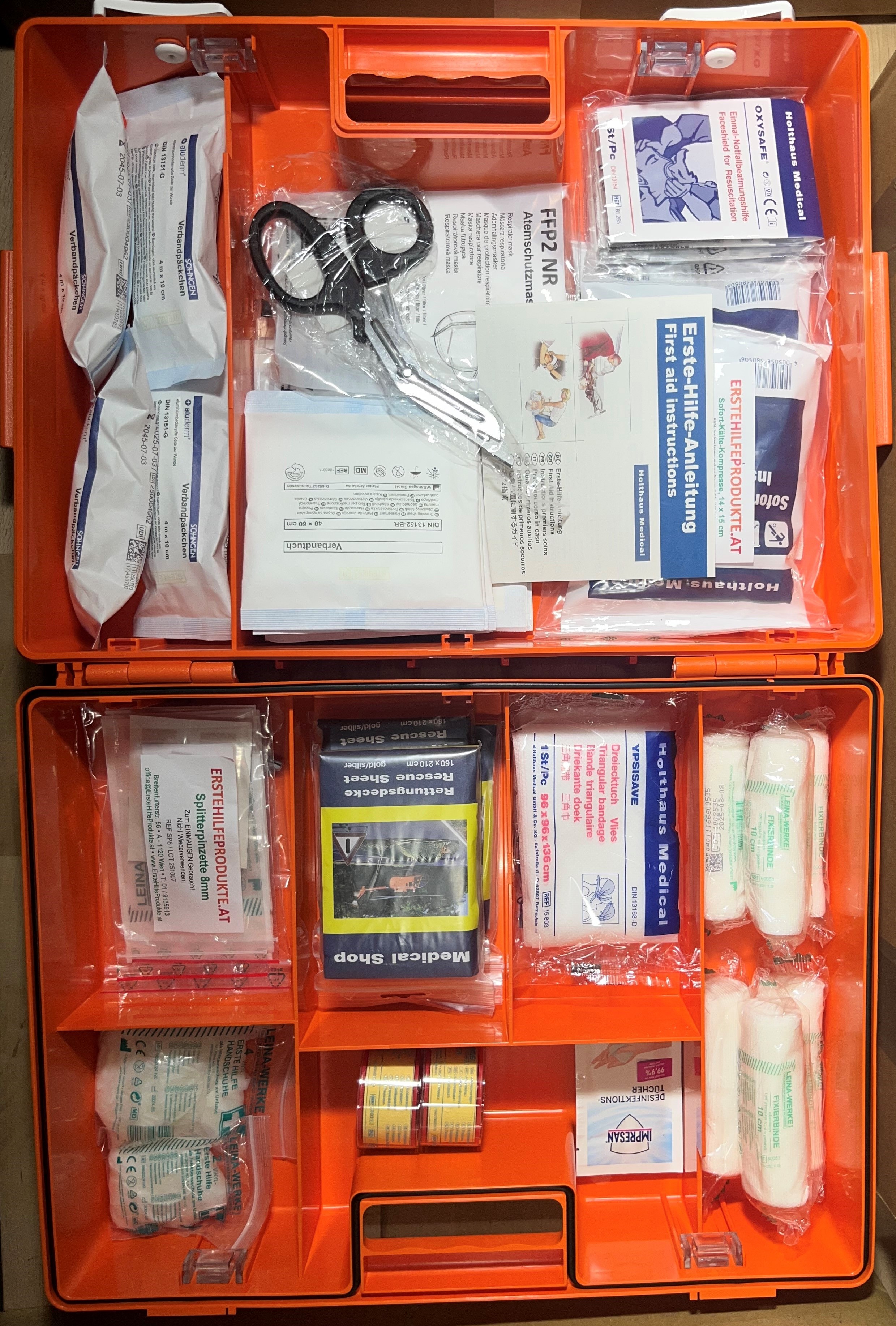 Erste Hilfe Koffer gemäß ÖNORM Z 1020:2025 inkl. Komplettfüllung mit 20 Jahre haltbaren Sterilprodukten.