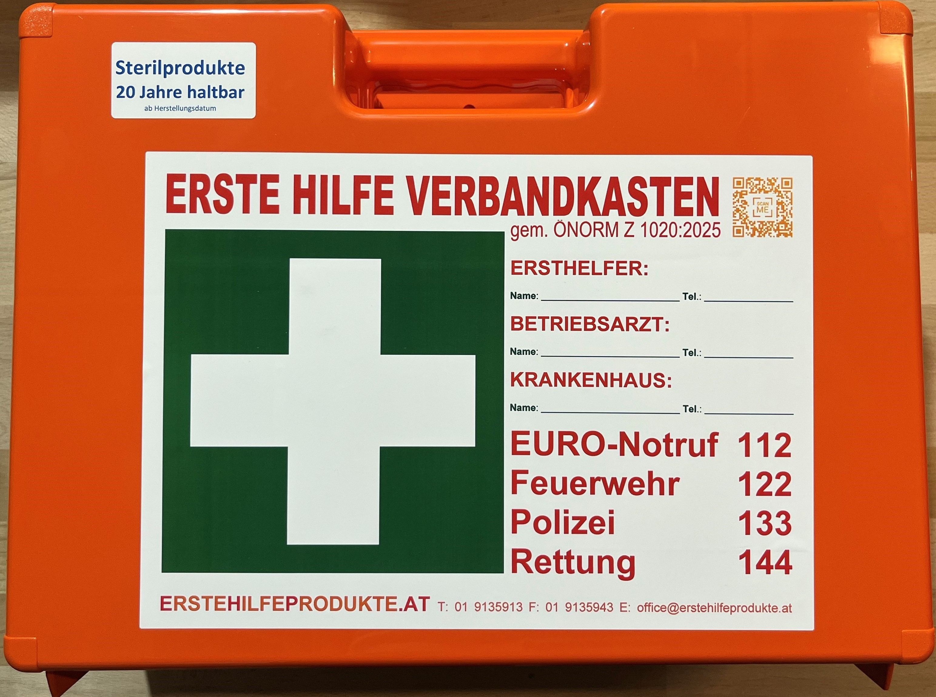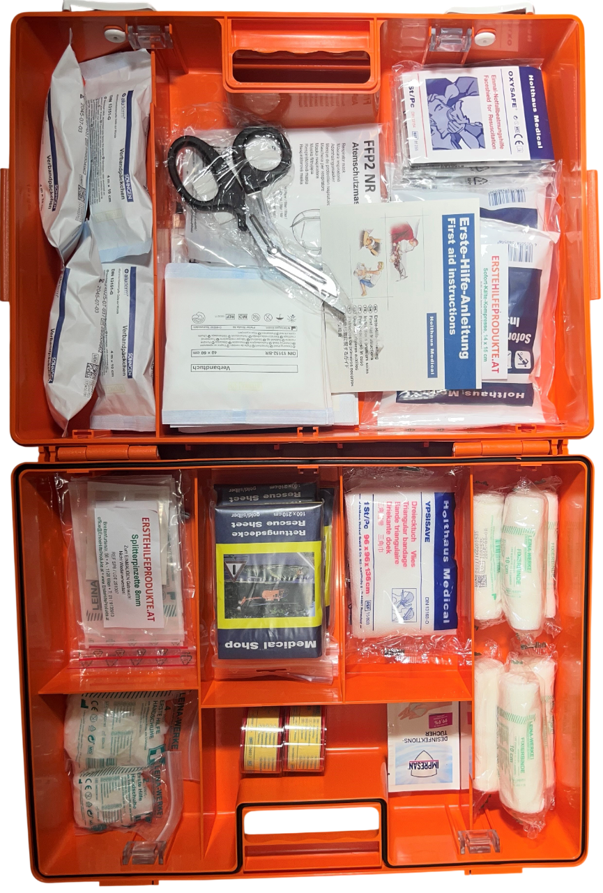 Erste Hilfe Koffer mit 20 Jahre haltbaren Sterilprodukten* ÖNORM Z1020:2025